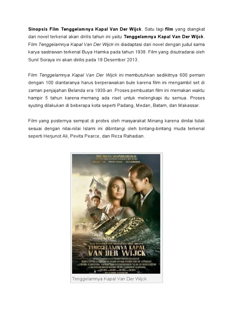 Resensi Tenggelamnya Kapal Van Der Wijck - Review Sinopsis Tenggelamnya Kapal Van Der Wijck Film Adaptasi Karya Terbaik Hamka - Azis anak orang berada yang masih sesuku dan terikat kerabat walaupun jauh dengan mamaknya hayati.. Novel ini mengisahkan tetang cinta, adat, keturunan, dan kekayaan. Ternyata, cerita ini mendapatkan sambutan luas masyarakat hingga mampu meningkatkan oplaag majalahnya. Nilai budaya jangan selalu memandang rendah suku dan adat orang lain, karena belum tentu adat dan suku kita itu lebih baik. Gaya penulisan gaya penulisan yang digunakan adalah menggunakan bahasa melayu. Hamka menulis novel itu berdasar pada kisah nyata mengenai kapal van der wijck yang berlayar dari pelabuhan tanjung perak, surabaya, menuju tanjung priok, jakarta, serta tenggelam di laut jawa, timur laut semarang, pada 21 oktober 1936.