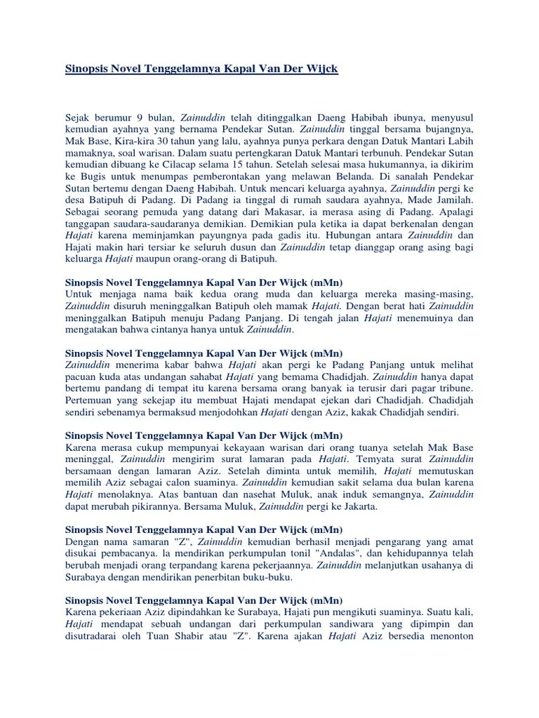 Setiap hamba yang ingin berusaha pasti akan ada jalannya. Dalam perjalanannya menuju ke minangkabau, tenggelam lah kapal yang dinaiki hayati. See full list on tulismenulis.com • siapa yang berbuat maka dia juga yang akan menerima balasan dari perbuatan itu. Novel sastra kota terbit : Hayati akhirnya menikah dengan azis kakak dari sahabatnya khadijah yang tinggal di padang panjang atas dasar pilihan hayati dan keputusan mamaknya yang sepakat menerima azis dan menolak lamaran zainuddin. Manfaat yang dirasakan saat membaca novel ini adalah mampu membuat pembaca kembali mengingat sejarah indonesia pada era sebelum kemerdekaan. Meskipun sekolajnya hanya sampai kelas ii sekolah dasar saja, namun ia mendapat pendidikan agama dan bahasa arab yang luas dan dari ayahnya. More images for resensi tenggelamnya kapal van der wijck » Hayati dan aziz akhirnya berpisah, aziz mati bunuh diri dan hayati menjanda. Orang yang rumahnya di tumpangi zainuddin sewaktu berada di batipuh (padang panjang), dia juga termasuk orang yang memandang rendah zainuddin karena zainuddin bukan orang kaya atau ternama. Buya hamka menggambarkan negeri padang dengan begitu indah dan menawan. Roman ini sangat menyentuh hati pembacanya.